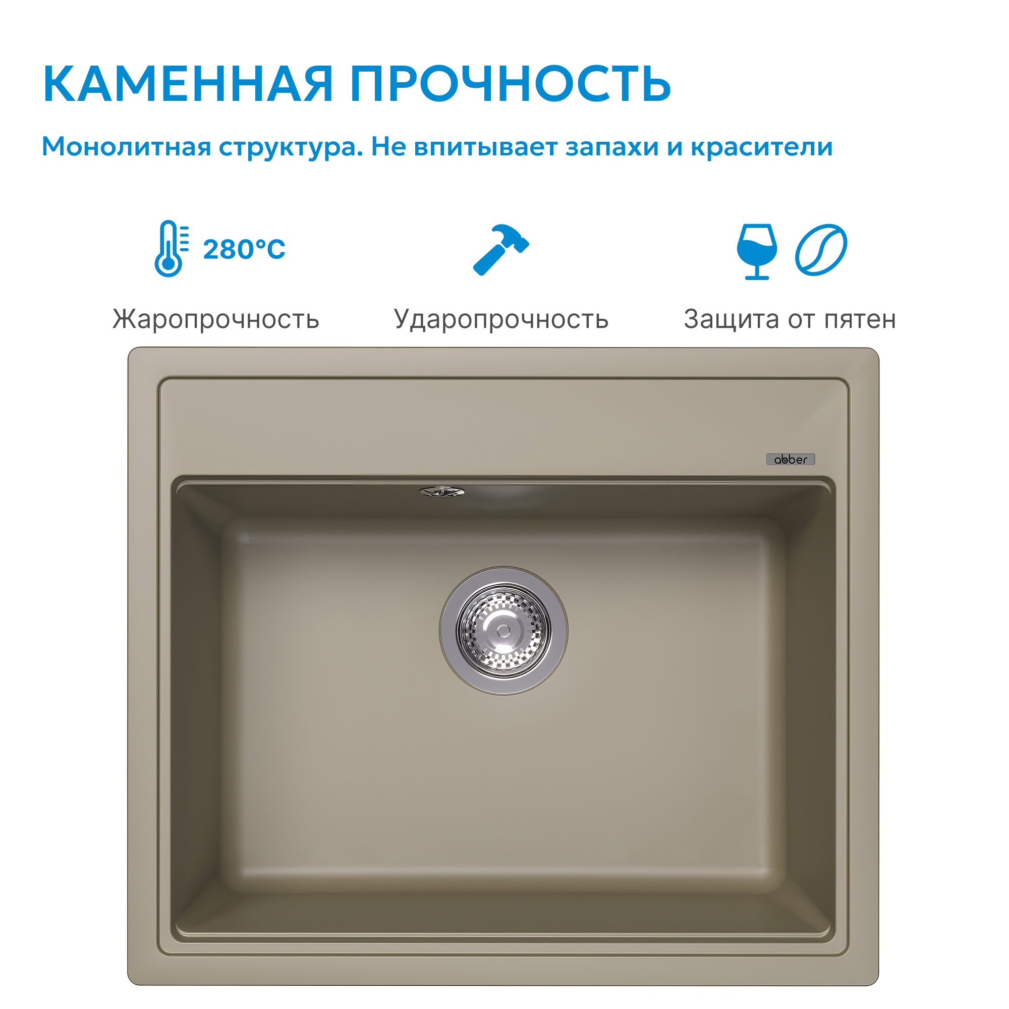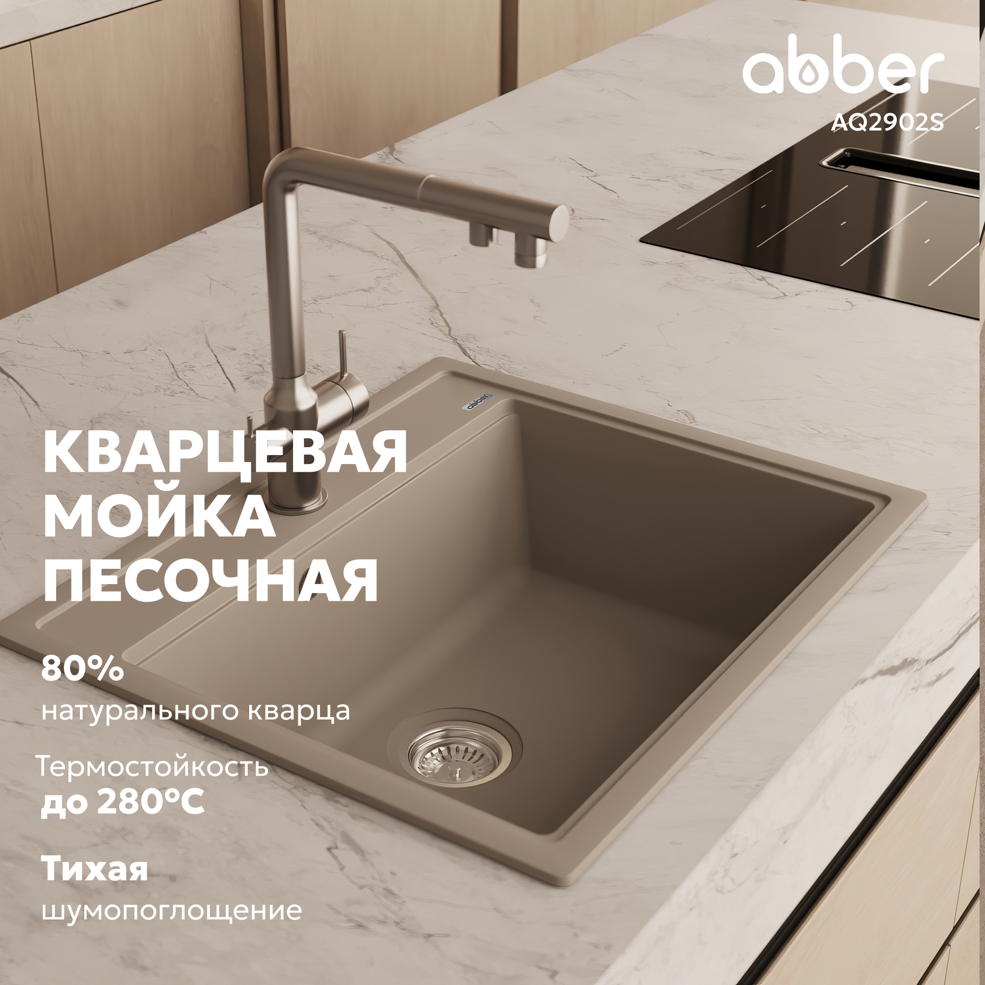 Кухонные мойки ABBER из кварцевого композита — это долговечность, надежность и простота в уходе. Лаконичный, сбалансированный дизайн Песочной кварцевой мойки 60х51х21,7см и ее натуральный цвет подойдет почти к любому стилю кухни. Вы можете выбрать мойку с крылом или без. Чтобы очистить мойку, не нужно использовать какие-то специализированные средства. Кварцевая мойка не боится повреждений, не окрашиваются продуктами. Как натуральный камень, но лучше и дешевле!