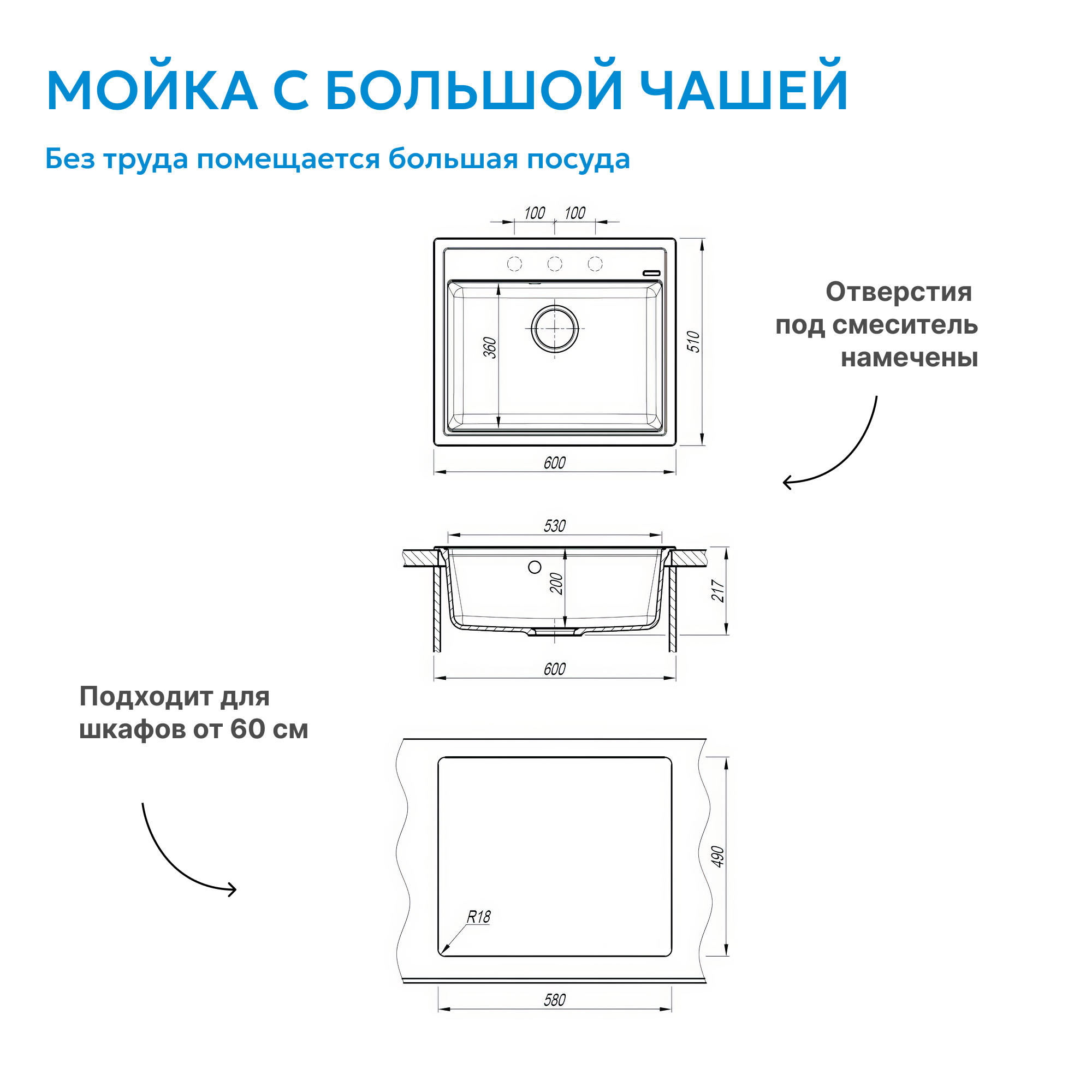 - Удобство монтажа — предусмотрено намеченное отверстие под смеситель, что облегчает установку и позволяет выбрать оптимальное положение.