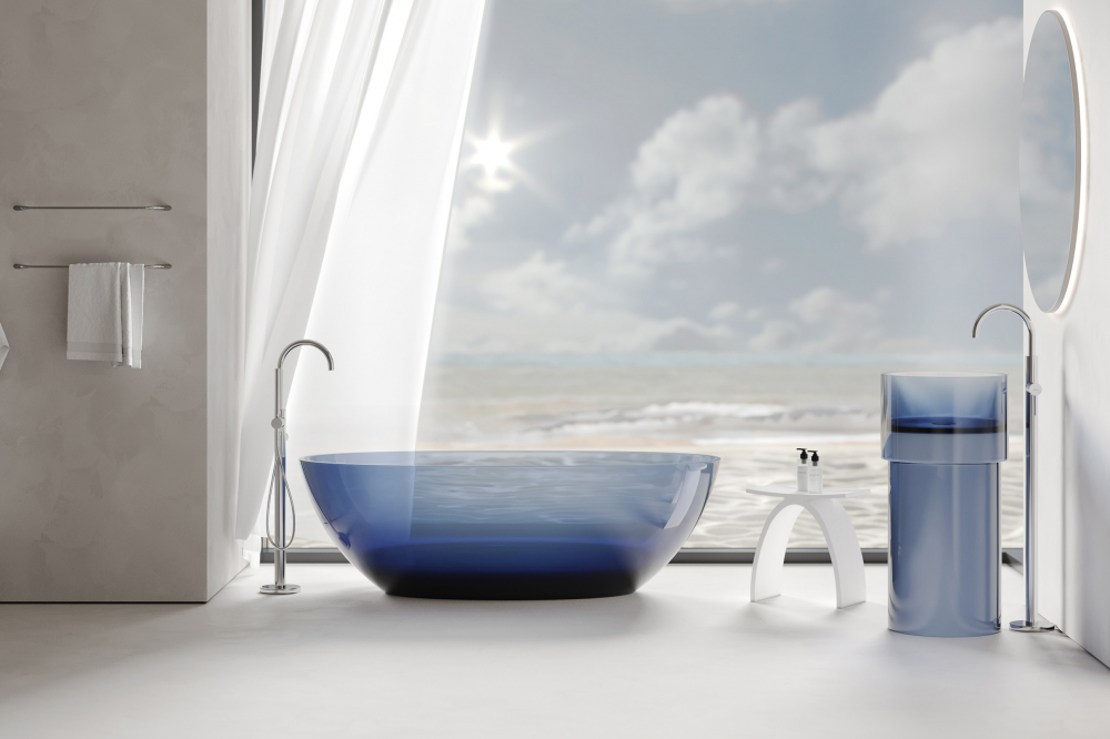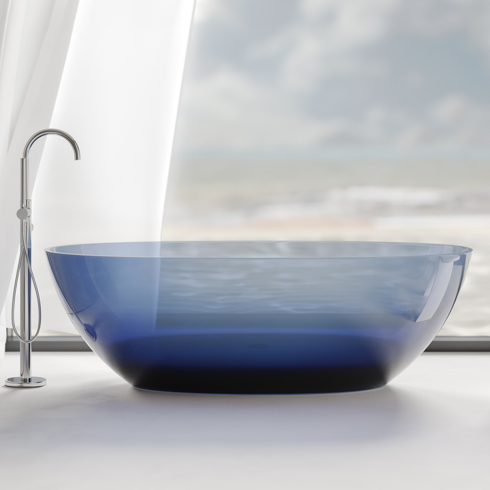 Представляем вашему вниманию стильное решение для ванной комнаты – элегантную ванну из высококачественной полиэфирной смолы. Благородный синий цвет и прозрачная структура материала создают неповторимый эффект, который станет настоящим украшением вашего интерьера.