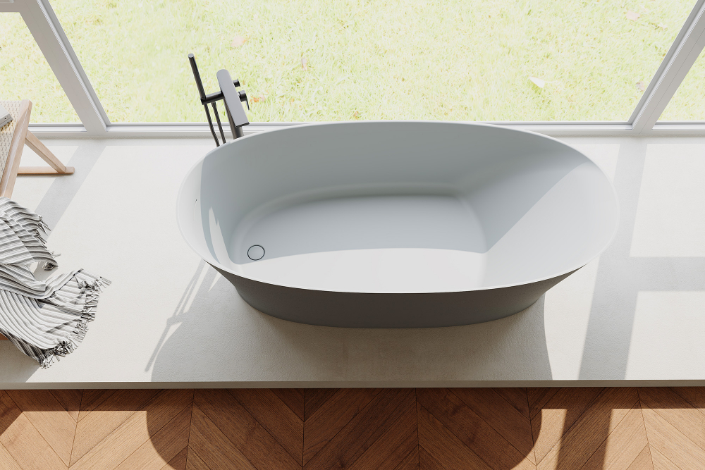 - Прочный материал. Ванна изготовлена из искусственного камня — композитного материала, который превосходит натуральный по ударопрочности и устойчивости к царапинам.